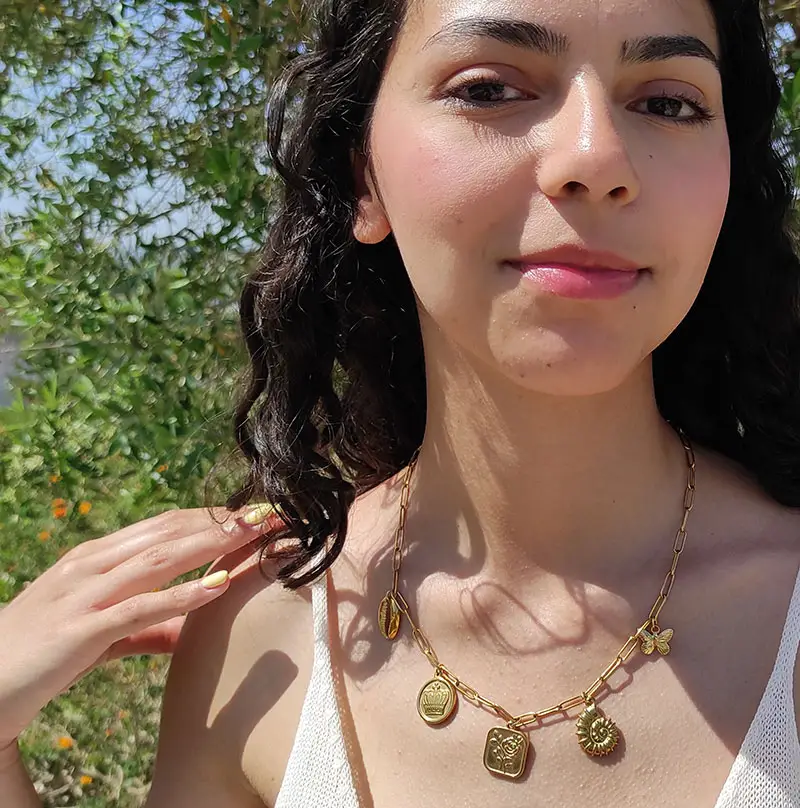 Um colar que conta histórias de liberdade, força e transformação. Os cinco pendentes representam símbolos de beleza e energia: o búzio que guarda segredos do mar, a coroa que lembra o poder interior, a rosa que floresce com amor, o caracol que nos convida a abrandar e a borboleta que celebra a leveza da mudança.