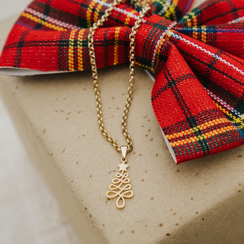- Design: Malha portuguesa com pendente natalício em formato de árvore de Natal, combinando elegância e originalidade.